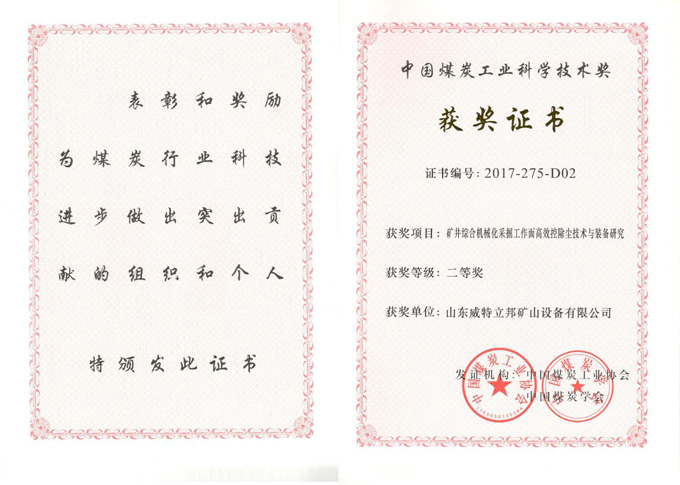 • 巖巷機械化掘進粉塵污染控制技術及裝備科學技術進步獎